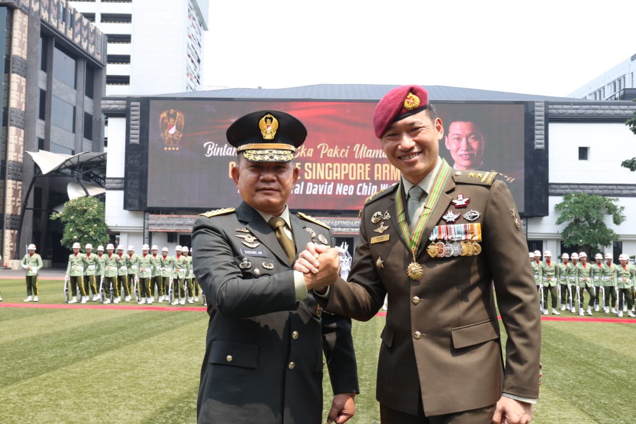 JAKARTA, Sekawanbaru.com – Sebagai bentuk penghargaan atas terjalinnya kerja sama militer selama 35 tahun antara TNI Angkatan Darat dan Angkatan Darat Singapura, Kepala Staf Angkatan Darat (Kasad) Jenderal TNI Dr. Dudung Abdurachman, atas nama Negara Republik Indonesia, menganugerahkan Bintang Kartika Eka Paksi Utama kepada Chief of The Singapore Army (Kasad Singapura), Major General David Neo Chin Wee, di Markas Besar Angkatan Darat (Mabesad), Jakarta, Senin (18/9/2023).