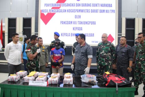 Pangdam XII/Tpr Mayjen TNI Iwan Setiawan selaku Pangkogasgabpam Wilstrad saat memberikan keterangan menyampaikan, hari ini pelaku dan beserta barang bukti sabu seberat 11,008 Kilogram diserahkan oleh Kodam kepada BNN Provinsi Kalbar untuk dilakukan proses hukum selanjutnya.