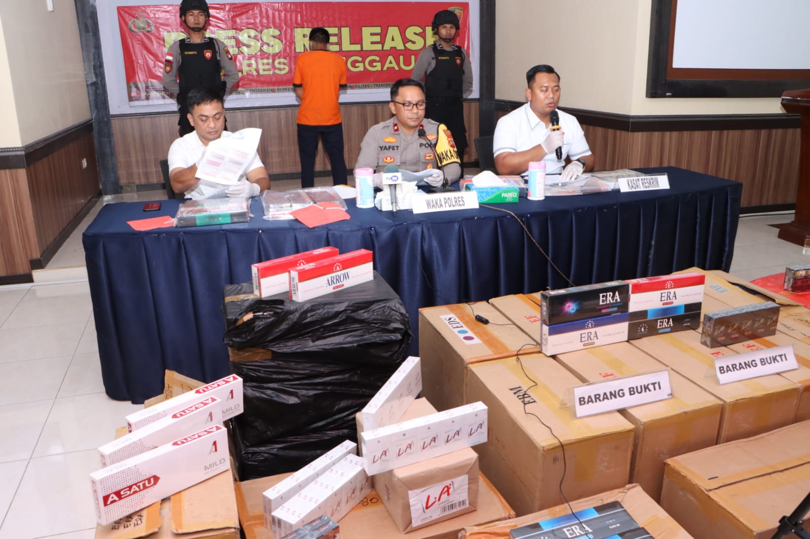 “Beberapa hari ini, kami Jajaran polres sanggau berhasil menggagalkan peredaran rokok ilegal tenpa cukai di daerah kecamatan Tayan Hilir dengan satu orang tersangka berinisial M,” Kata Wakapolres Sanggau Kompol Yafet Efraim Patabang saat melakukan pers rilis di Mapolres Sanggau, Rabu 20 Maret 2023.