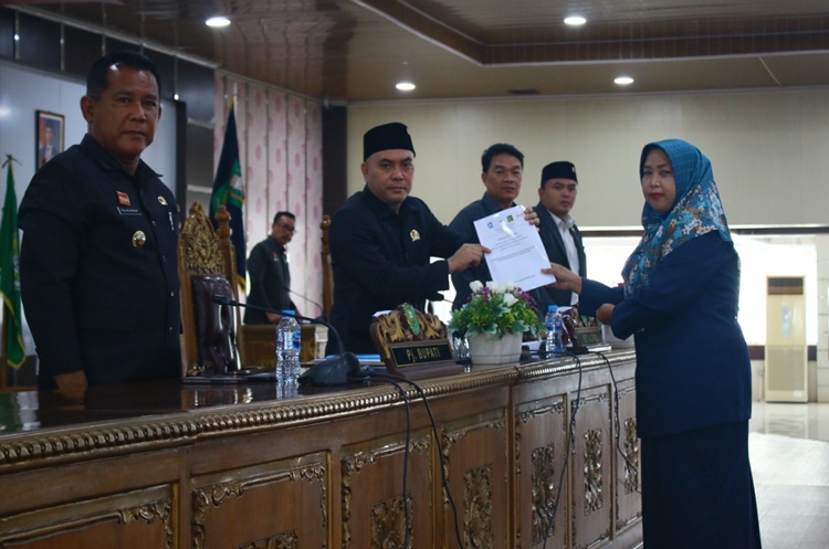Foto - Penyerahan Berkas Pendapat Ahir Fraksi Amanat Persatuan olehTitik Erni Kurniah yang diterima oleh Ketua DPRD Sanggau.