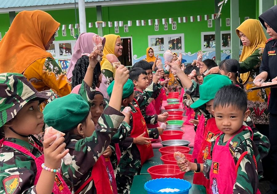 SANGGAU – Sekawanbaru.com -, Seratusan anak TK Kartika tampak bingung ketika dihadapannya banyak baskom kecil berjejer rapi berisi tepung dan air.