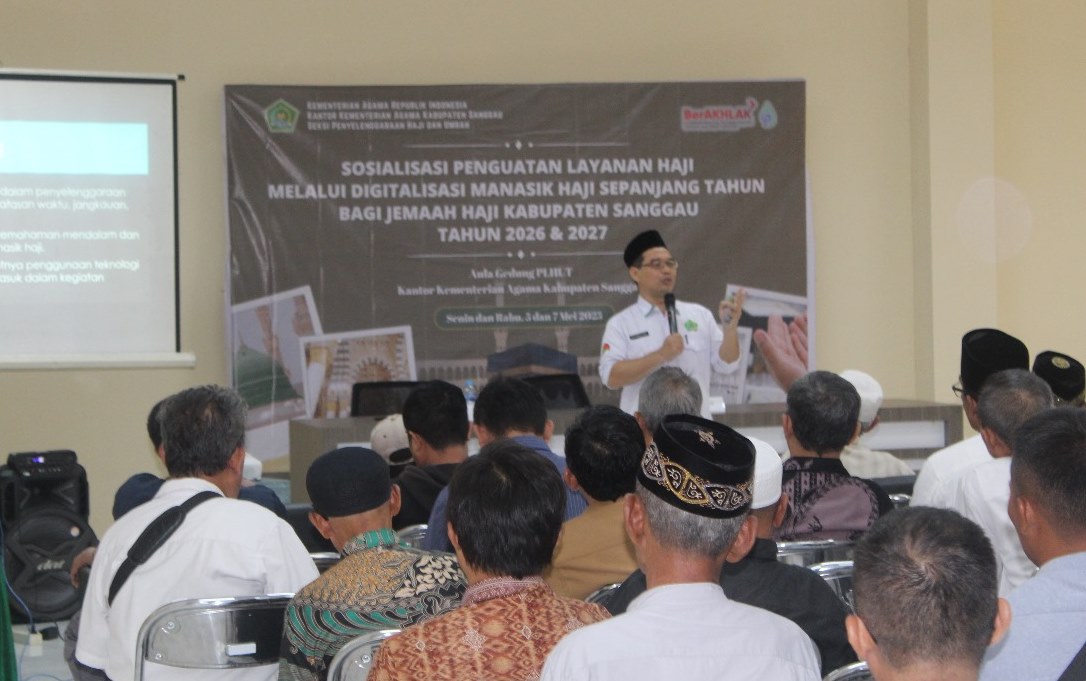SANGGAU- Sekawanbaru.com – Dalam upaya meningkatkan kualitas layanan haji dan pemahaman mendalam bagi para calon jemaah haji , Seksi Penyelenggaraan Haji dan Umrah (PHU) Kantor Kementerian Agama Kabupaten Sanggau menggelar kegiatan Sosialisasi Penguatan Layanan Haji melalui Digitalisasi Manasik Haji secara berkelanjutan untuk tahun 2026 dan 2027. Kegiatan ini resmi dimulai pada Senin, 4 Mei 2025, di Gedung PLHUT Kankemenag Sanggau.