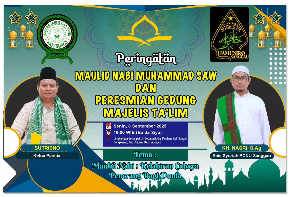 Acara akan berlangsung pada Senin, 8 September 2025 pukul 19.00 WIB (ba’da Isya), bertempat di Lingkungan Setompak, Jl. Setompak Gg. Perdana, Kelurahan Sungai Sengkuang, Kecamatan Kapuas, Kabupaten Sanggau.