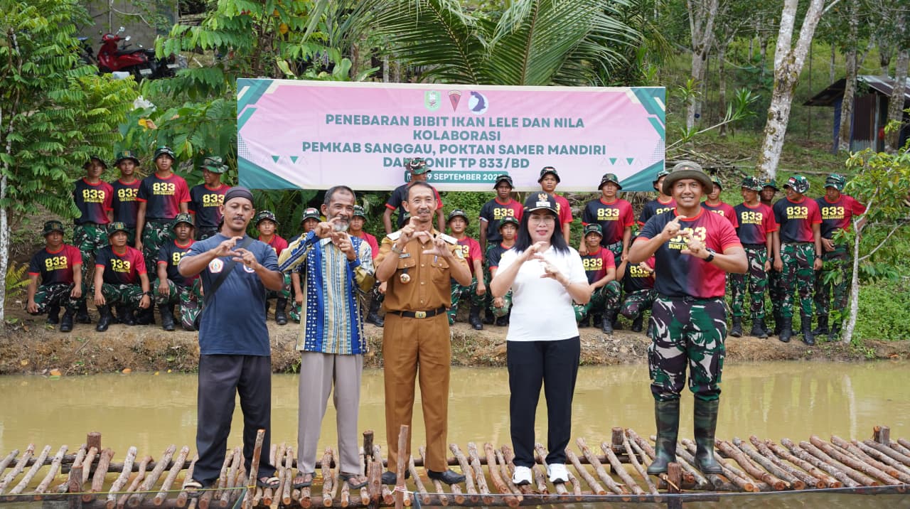 SANGGAU – Sekawanbaru.com – Yonif TP 833/Bumi Daranante berkolaborasi dengan Pemerintah Kabupaten Sanggau dan Kelompok Tani Sabang Merah Mandiri melaksanakan kegiatan penebaran 6.000 bibit ikan lele dan nila pada hari Senin (29/9/2025). Program ini merupakan wujud nyata kepedulian bersama dalam memperkuat sektor perikanan dan ketahanan pangan di wilayah Sanggau.