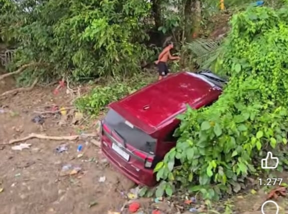 Foto// Kendaraan Toyota Calya plat KB 1306 FF nyungsep hampir masuk Sungai Kapuas di Tanjakan Penyeladi Sanggau//Dok