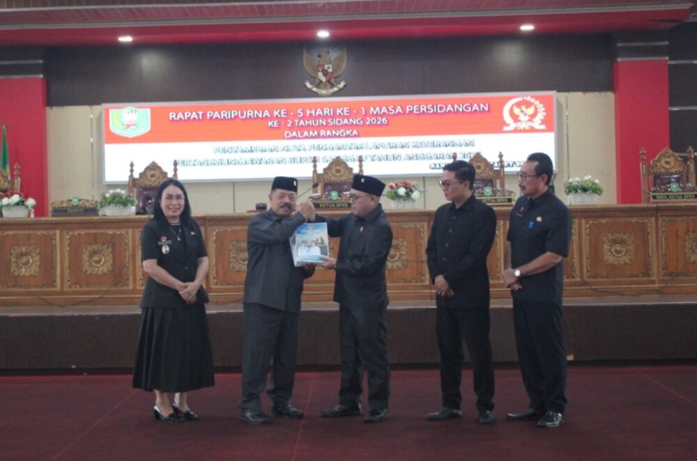 Dalam rapat tersebut, Bupati Sanggau menyampaikan secara resmi Nota Pengantar LKPJ Tahun Anggaran 2025 sebagai bentuk pertanggungjawaban kinerja penyelenggaraan pemerintahan daerah selama satu tahun anggaran.
