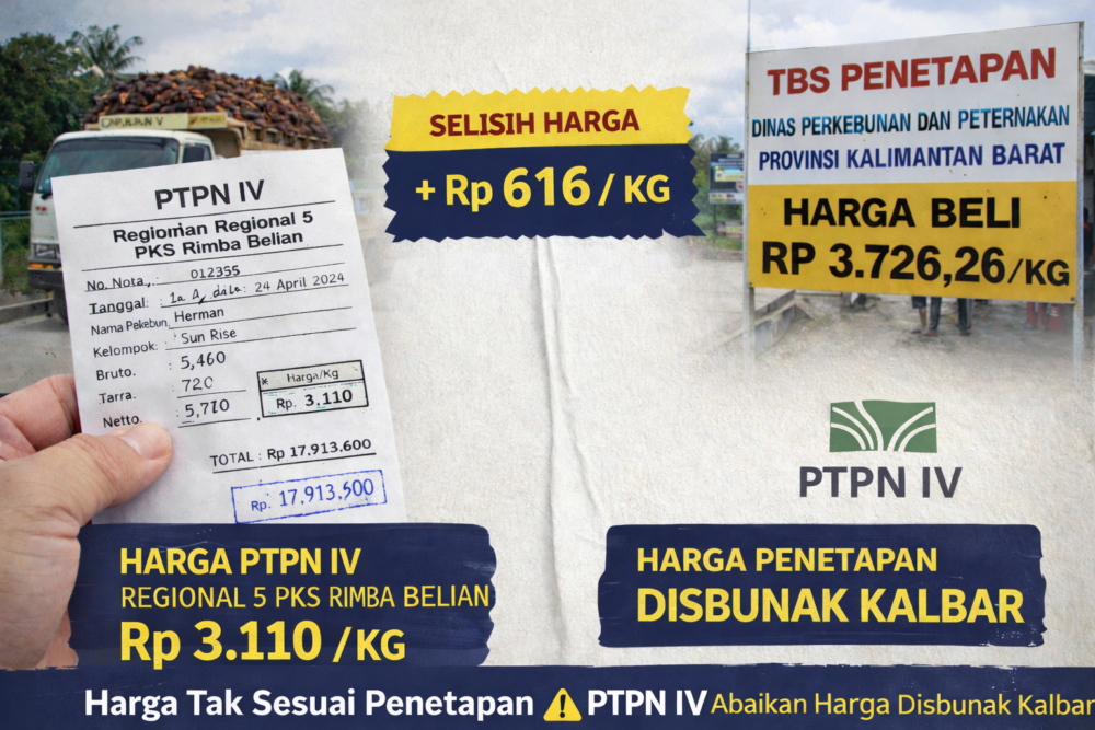 SANGGAU – Perbedaan harga pembelian Tandan Buah Segar (TBS) kelapa sawit kembali memicu sorotan. Kali ini, selisih harga antara yang ditetapkan Dinas Perkebunan dan Peternakan (Disbunak) Kalimantan Barat dengan harga yang diterapkan oleh PTPN IV Regional 5 PKS Rimba Belian Sanggau, dilaporkan mencapai kisaran Rp500 hingga Rp600 per kilogram.